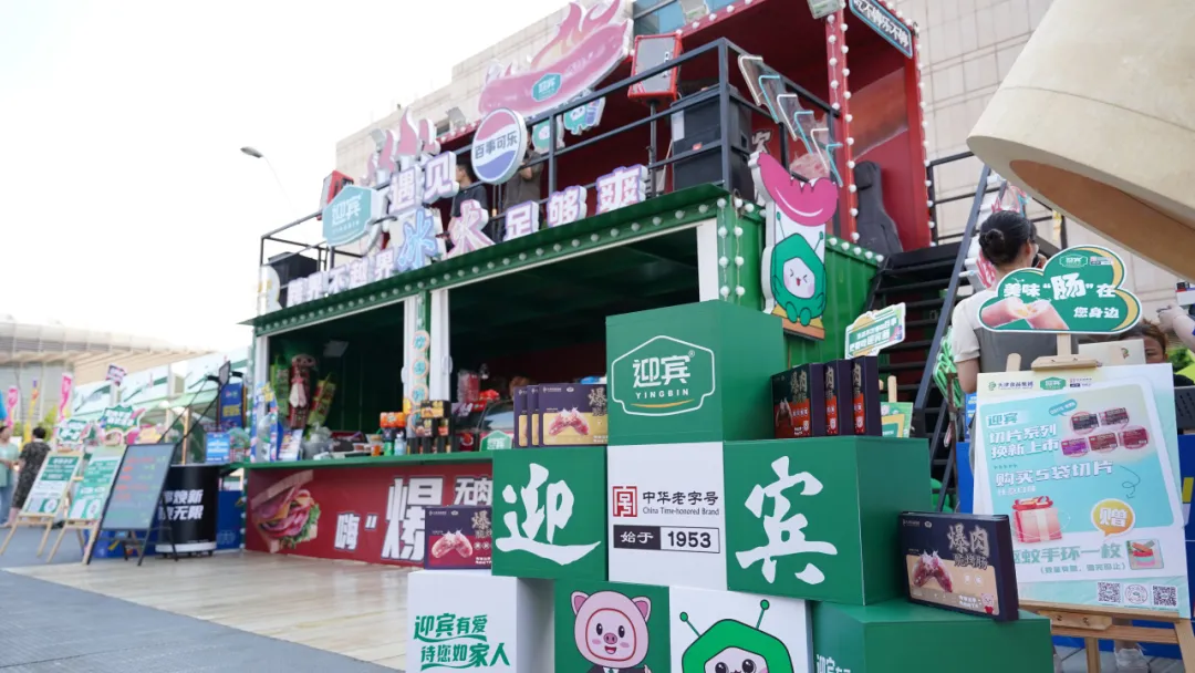 作為市集中的另一大亮點(diǎn),以紅綠撞色為主體思路,采用現(xiàn)代集裝箱風(fēng)格,頂部設(shè)置“烤腸”造型,與本次市集迎賓的主打新品“爆肉脆烤腸系列”前后呼應(yīng),4種口味滿(mǎn)足大眾味蕾。歌手每日演出精彩不停,讓消費(fèi)者在音樂(lè)中享受美食,游戲區(qū)和休閑區(qū)等多個(gè)打卡點(diǎn)吸引消費(fèi)者眼球。此外,迎賓與百事攜手聯(lián)名打造了跨界不越界的冰火效果,提高了迎賓的品牌知名度,迎賓與百事將以此為契機(jī),穩(wěn)步推進(jìn)深度合作。