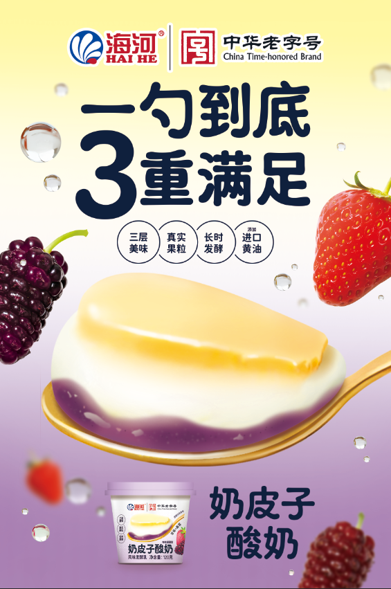 輕輕揭開杯蓋,來一場(chǎng)舌尖上的立體穿越。啟程于凝脂般金黃濃醇的奶皮子,特選進(jìn)口黃油在單杯慢發(fā)酵時(shí)光中凝萃的精華,每一口都是濃郁的脂香序曲。勺子如探險(xiǎn)家般向下穿梭,觸達(dá)雪白柔滑的酸奶腹地,自然發(fā)酵的清新酸香溫柔承接。而旅程的高潮,在杯底熱烈綻放,大顆草莓與桑葚果粒浸潤(rùn)在絳紫色果醬中,如同埋藏的味覺寶藏。一勺到底,不是簡(jiǎn)單的分層品嘗,而是一次從濃郁奶脂、清新乳香到鮮活果粒爆漿的完整味覺敘事,金黃、雪白、絳紫在口中奏響出層次分明的交響曲。這杯酸奶,讓“吃”變成一場(chǎng)奇妙的感官旅程,直接開辟了“果粒奶皮子酸奶”這一全新細(xì)分賽道,海河乳品公司也成為該領(lǐng)域無可爭(zhēng)議的定義者與領(lǐng)跑者。