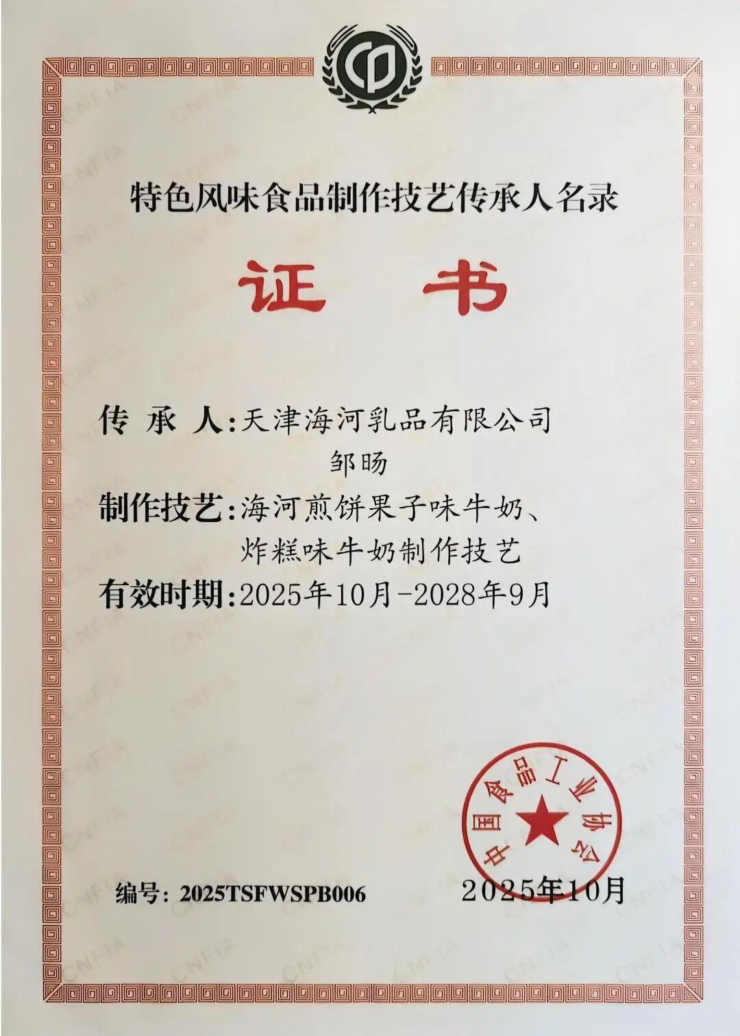 近日,中國食品工業(yè)協(xié)會公布第二批“特色風味食品標志性產品、制作技藝傳承人名錄”。海河乳品公司黨委書記、董事長鄒旸榮獲“特色風味食品制作技藝傳承人”稱號。煎餅果子味牛奶、炸糕味牛奶榮膺“特色風味食品標志性產品”。這一由國家行業(yè)權威組織、經專家多輪評審認定的成果,標志著海河乳品公司在傳承與創(chuàng)新地域特色食品、推動傳統(tǒng)風味現(xiàn)代化轉型方面走在了行業(yè)前列,為老字號品牌注入了強勁動能。