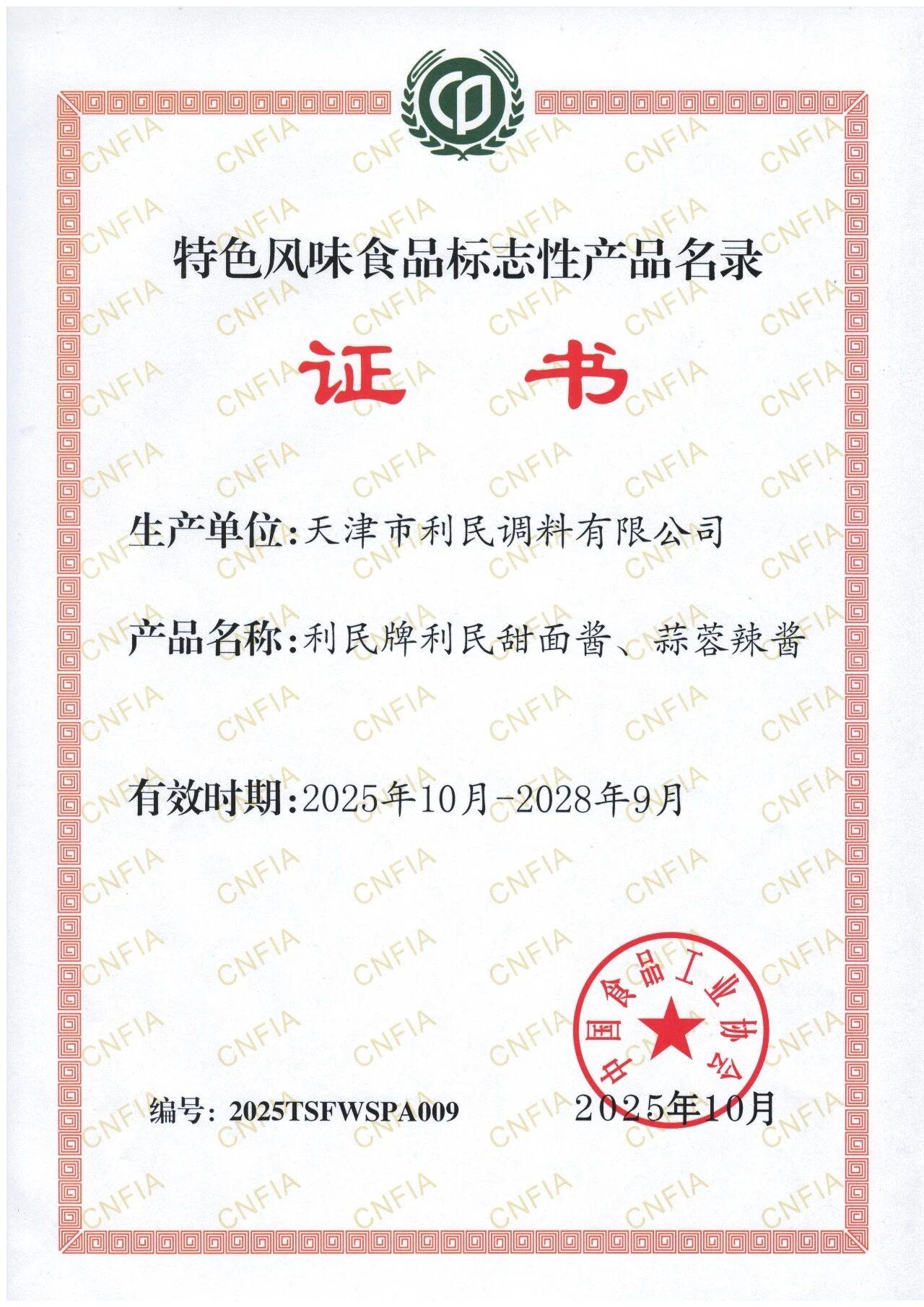 近日,利民公司喜訊頻傳,“利民”品牌獲評2024-2025年度天津市首批消費名品企業(yè)品牌稱號,旗下經典產品利民甜面醬、蒜蓉辣醬成功入選中國食品工業(yè)協會認定的第二批“特色風味食品標志性產品名錄”,品牌發(fā)展與產品實力獲得市場與行業(yè)的高度認可。