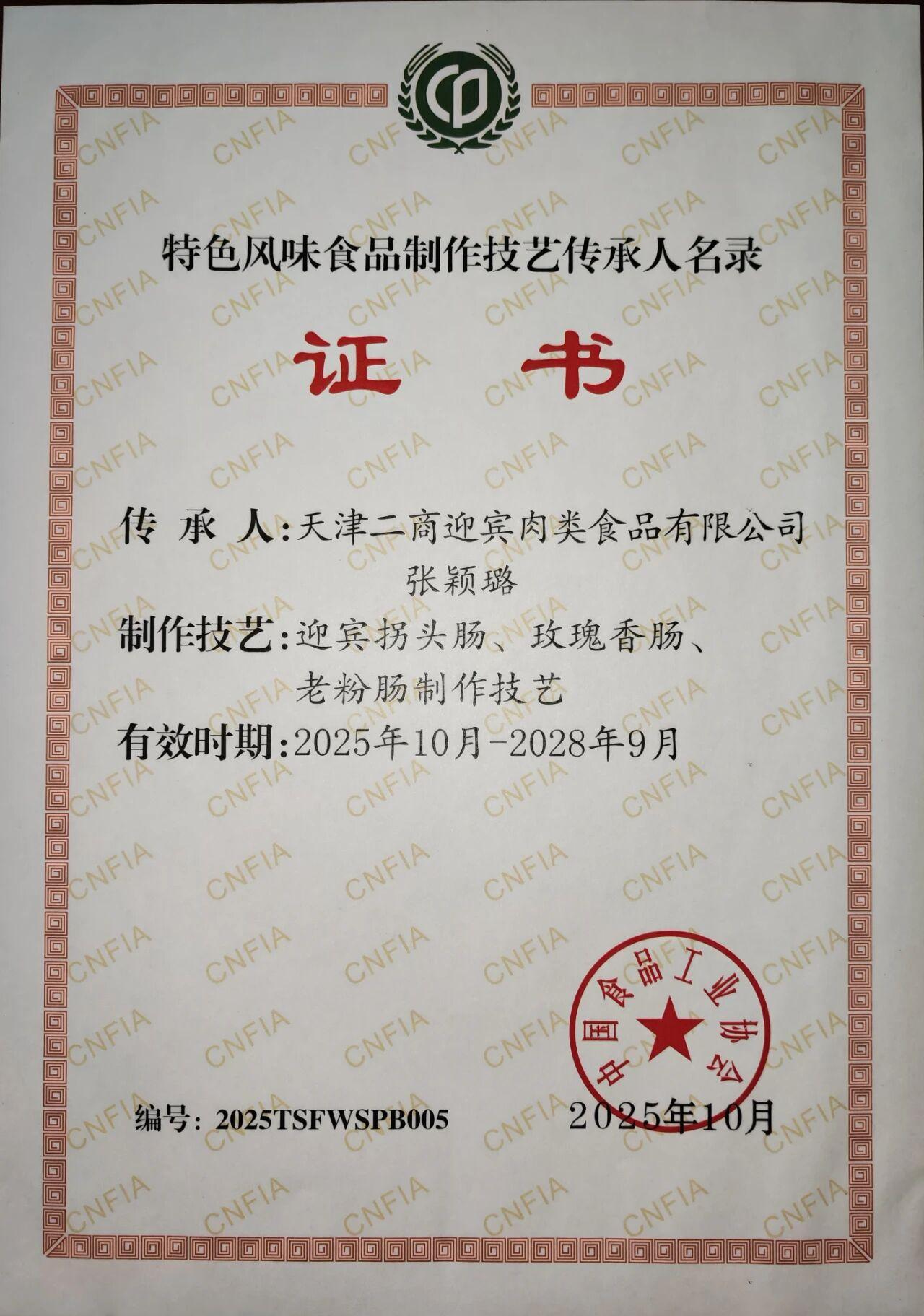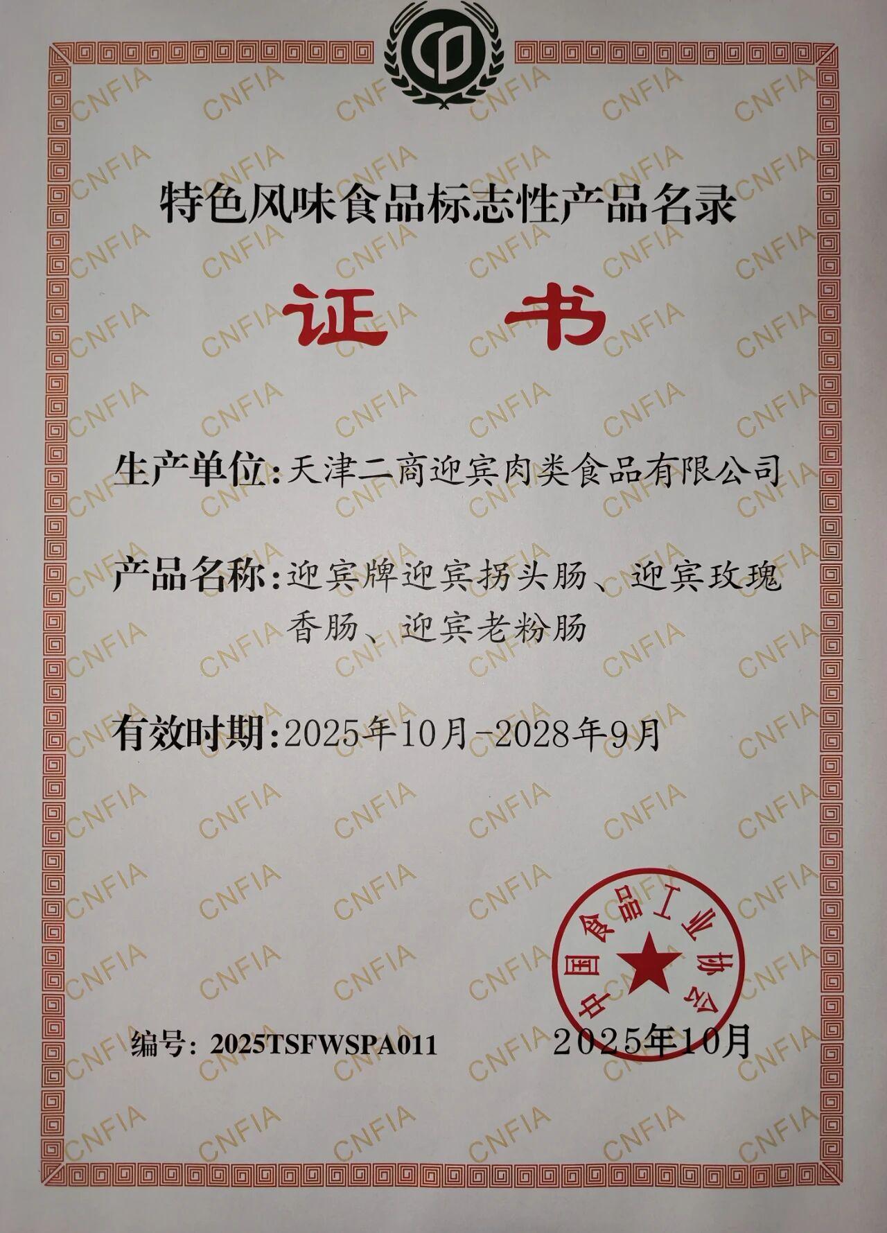 近日,中國食品工業(yè)協(xié)會公布第二批“特色風(fēng)味食品標(biāo)志性產(chǎn)品、制作技藝傳承人名錄”。迎賓公司黨委副書記、總經(jīng)理張穎璐獲評“特色風(fēng)味食品制作技藝傳承人”;迎賓拐頭香腸、迎賓玫瑰香腸、迎賓老粉腸入選“特色風(fēng)味食品標(biāo)志性產(chǎn)品”。