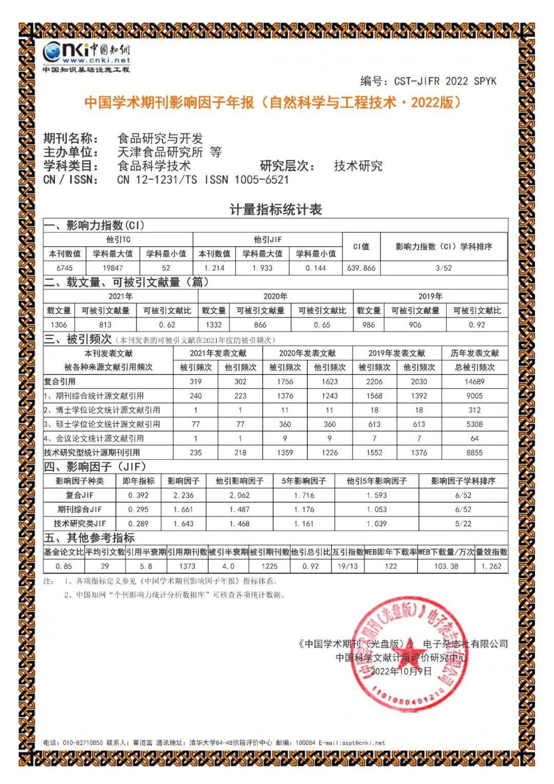 日前,中國學(xué)術(shù)期刊(光盤版)電子雜志社有限公司、中國科學(xué)文獻(xiàn)計量評價研究中心編制出版的《中國學(xué)術(shù)期刊影響因子年報(自然科學(xué)與工程技術(shù)·2022版)》正式發(fā)布。食品集團(tuán)主管,天津市食品研究所主辦的期刊《食品研究與開發(fā)》的影響力指數(shù)穩(wěn)居本學(xué)科第三位。